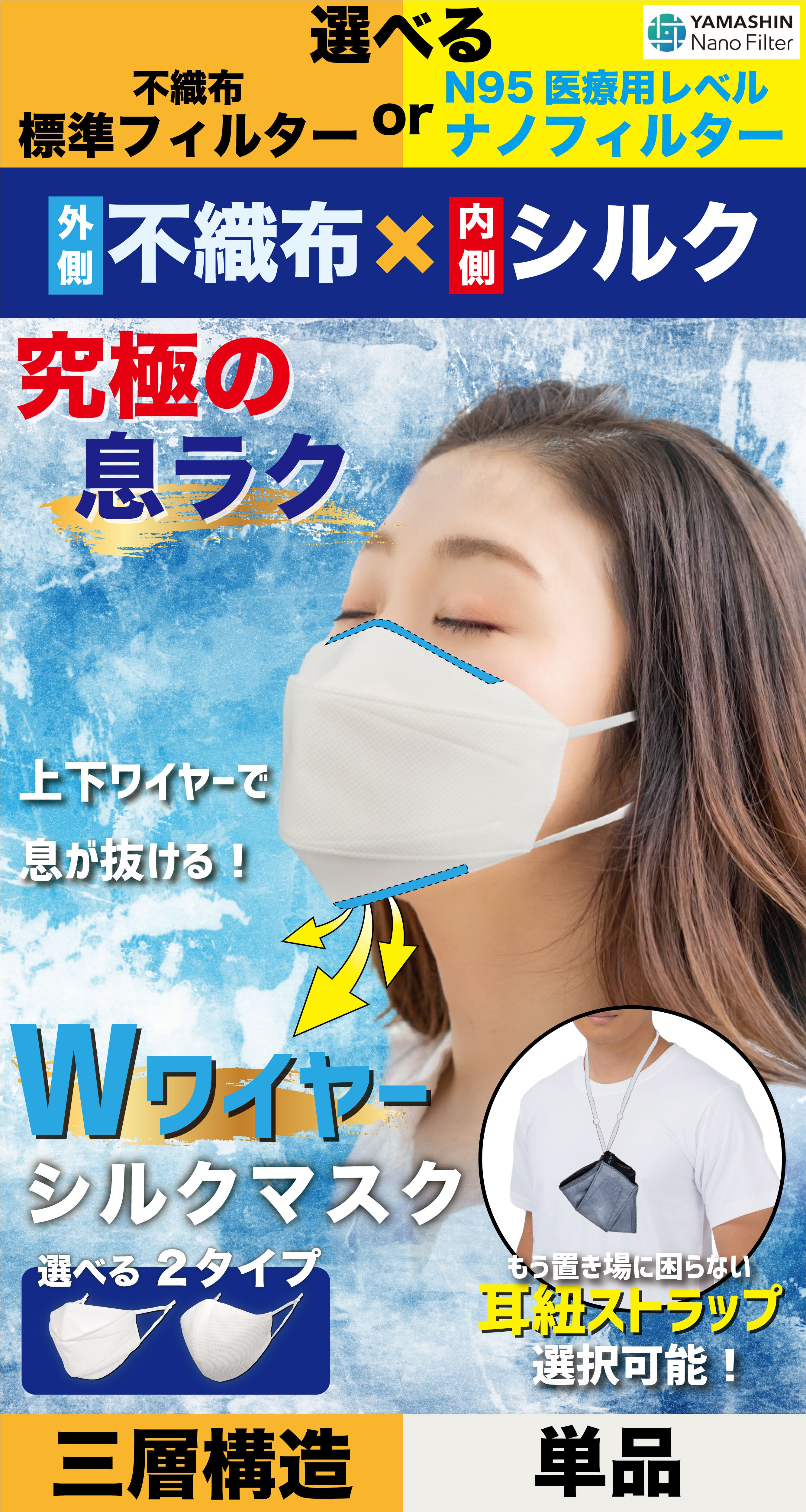 【※この商品は、5~6営業日(土・日・祝を除く)以内に順次お届け先住所に向けて発送いたします。注文が殺到している場合は、発送が遅れますこと、あらかじめご了承ください。到着日時指定は承れません。】 ※現在透かし織生地のみで提供しております。 ■「Wワイヤー構造で蒸れない・超通気の体感」 マスクを長時間着用すると、マスク内の温度・湿度が上昇します。猛暑日などの着用は時として生命にかかわる危険があり、定期的な換気が重要です。Wワイヤーは、装着した状態のままマスクの換気ができる機能です。使う人のフェイスラインにあわせてカタチを変えることで、マスク内の密着状態と通気状態を自由にチェンジ。暑さや蒸れた空気を排気し、快適な環境を保持します。 ※耳紐オプション選択 ■サッと外して サッと装着。首にかける「ストラップ付き」 飲食時などに外したマスクを首から下げれば、テーブルの上に置いたり鞄に入れたりするよりも清潔。マスクケースを持ち歩く必要もなく、紛失防止にもなります。耳ゴムをそのままストラップにした一体型の設計になっているのでストラップも硬い紐ではなく、柔らかいゴムになっているので長時間着用しても疲れづらく、肌にも優しい。 ■見た目は不織布マスク。内側はシルクの「見た目不織布マスクシリーズ」 表からはまるで不織布マスクですが、肌に当たる裏地は肌に優しい絹を使用。 ■話題の新素材『ヤマシンナノフィルタ®』使用 通気性を重視した、新しい『ナノファイバーフィルタ』 ヤマシンナノフィルタ®が内蔵されており、スリムで高機能な仕上がり。 不織布マスクと重ねて使う際に大事な通気性と、機能性の両立を可能にしました。 ナノレベルの微細な孔で洗濯前のPFE(微粒子捕集効率)は99%。カケンセンター手洗いモード50回のPFEは94.2%。 ※PFE試験(一般財団法人カケンテストセンター実施) ■全てのタイプでワイヤーが入っております。