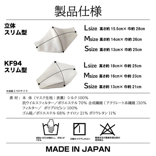 【立体スリム型】 Lサイズ 高さ 約15.5cm×巾 約28cm Mサイズ 高さ 約14cm×巾 約26cm Sサイズ 高さ 約13cm×巾 約25cm 【KF94スリム型】 Lサイズ 高さ 約18cm×巾 約25cm Mサイズ 高さ 約16cm×巾 約23cm Sサイズ 高さ 約13cm×巾 約21cm
