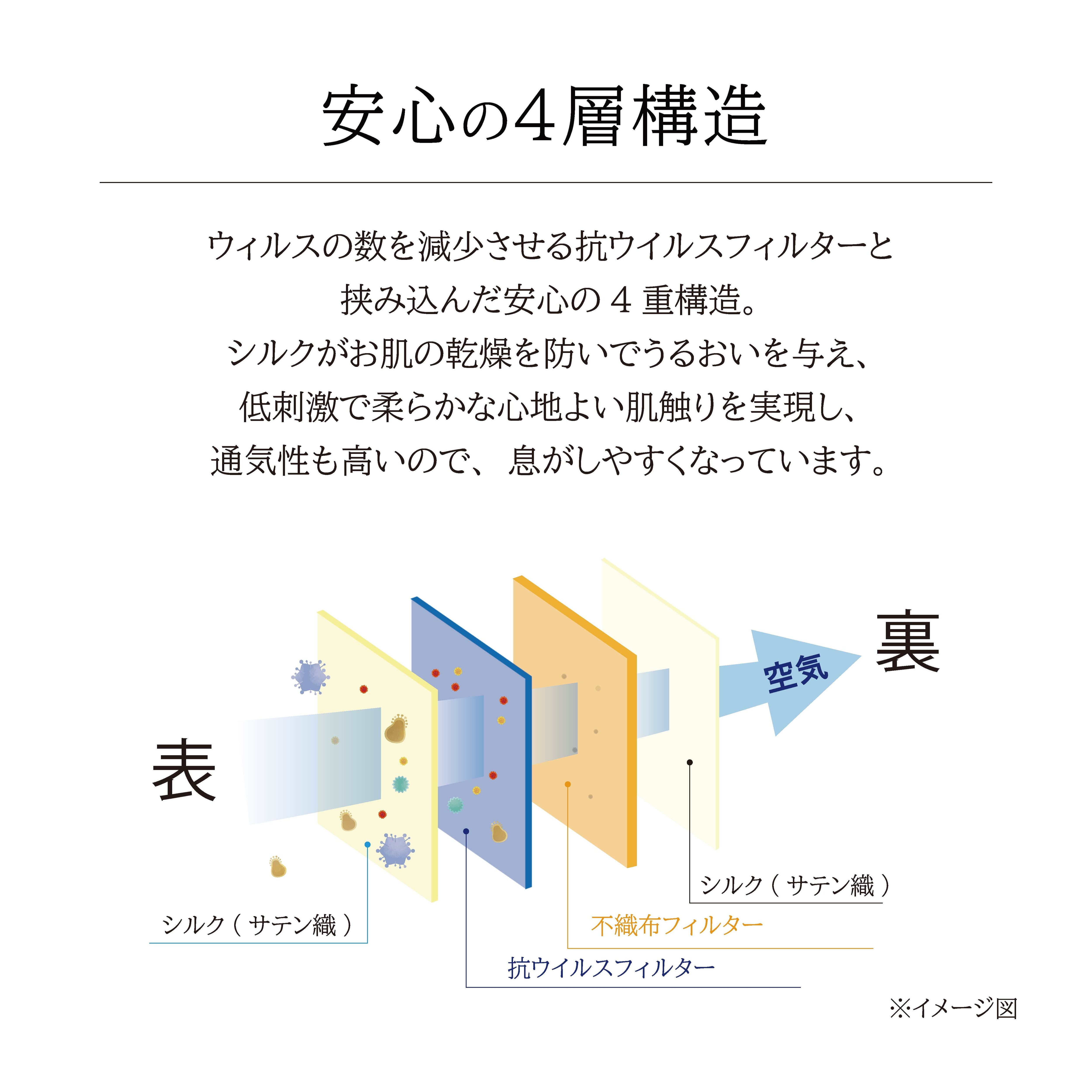 本 体(マスク生地:表裏)シルク100% 高密度フィルター/ ポリプロピレン100% ゴム紐/ポリエステル68% ナイロン21% ポリウレタン11%