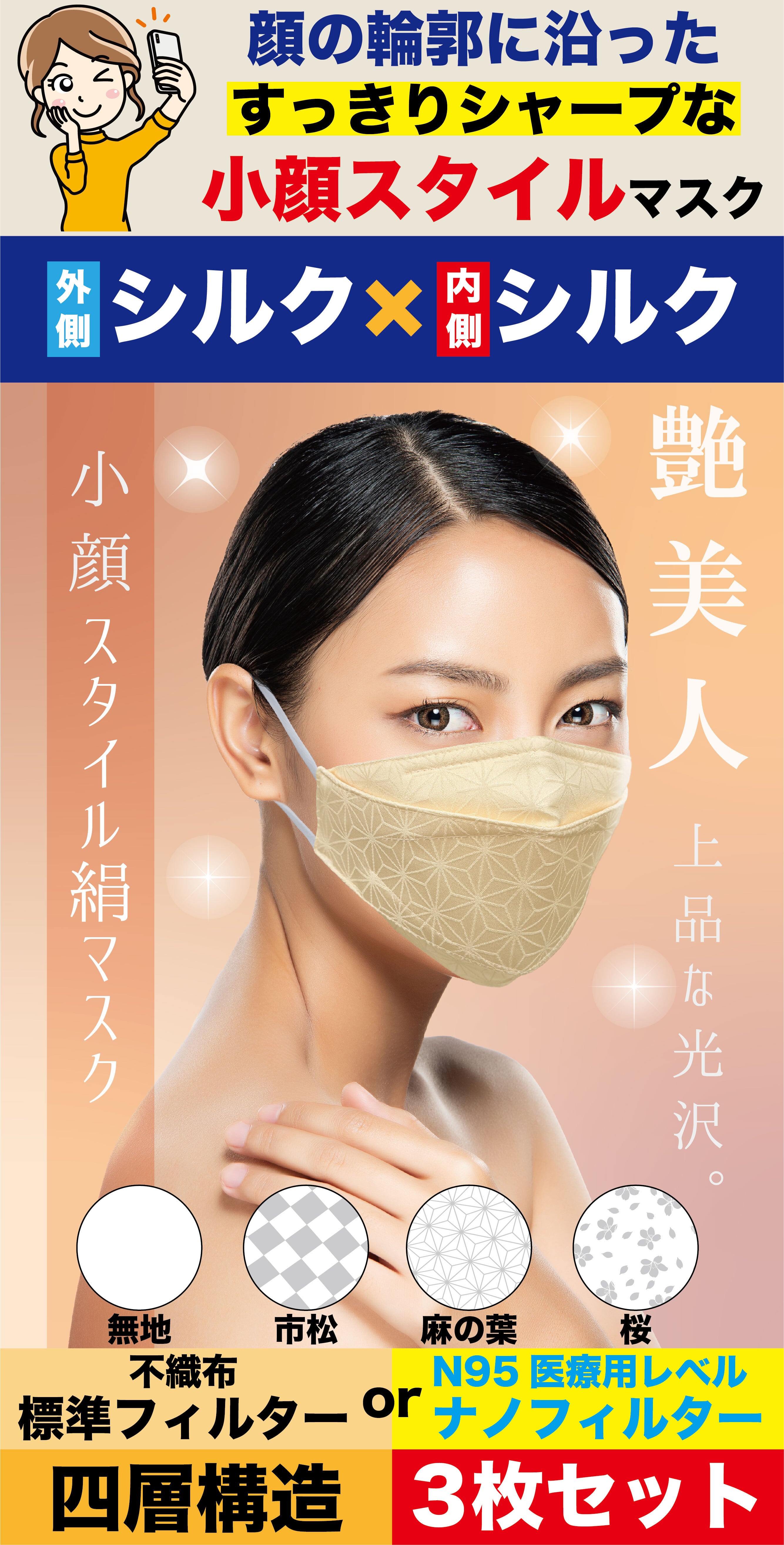 【※この商品は、5~10営業日(土・日・祝を除く)以内に順次お届け先住所に向けて発送いたします。注文が殺到している場合は、発送が遅れますこと、あらかじめご了承ください。到着日時指定は承れません。】 ■よりシャープなスタイルへ 美しく小顔に見せてくれる艶ありサテン織絹マスクが登場。 顔の曲線に沿うように、スッキリシャープな印象のシルエットで、今までよりもスリムな印象を与えるマスクです。 使いやすさも追及。耳紐は縫い付けて、耳紐調節リング付きなのでサイズが調節が簡単にできます。 内側を十字縫いすることで、息を吸い込むときの生地の張り付きがなくなり、ストレスなくマスクを着用できます。 ■ノーズワイヤー ・KF94スリム型:ノーズワイヤー「あり」 ・立体スリム型:ノーズワイヤー「なし」 ■選べる3タイプの地紋デザイン。 日本文化の素晴らしさを伝える浴衣帯づくりの会社として、疫病 退散を願うシルク生地の地紋デザインにこだわりました。独自に開発したサテン織で描いたのは、「市松」、「麻の葉」、「桜 」の3種類。どれも縁起の良い和の伝統模様で、疫病退散の願いと大切な人の健康や幸 福を祈る想いを込めました。贈り物にもピッタリな開運絹マスクです。
